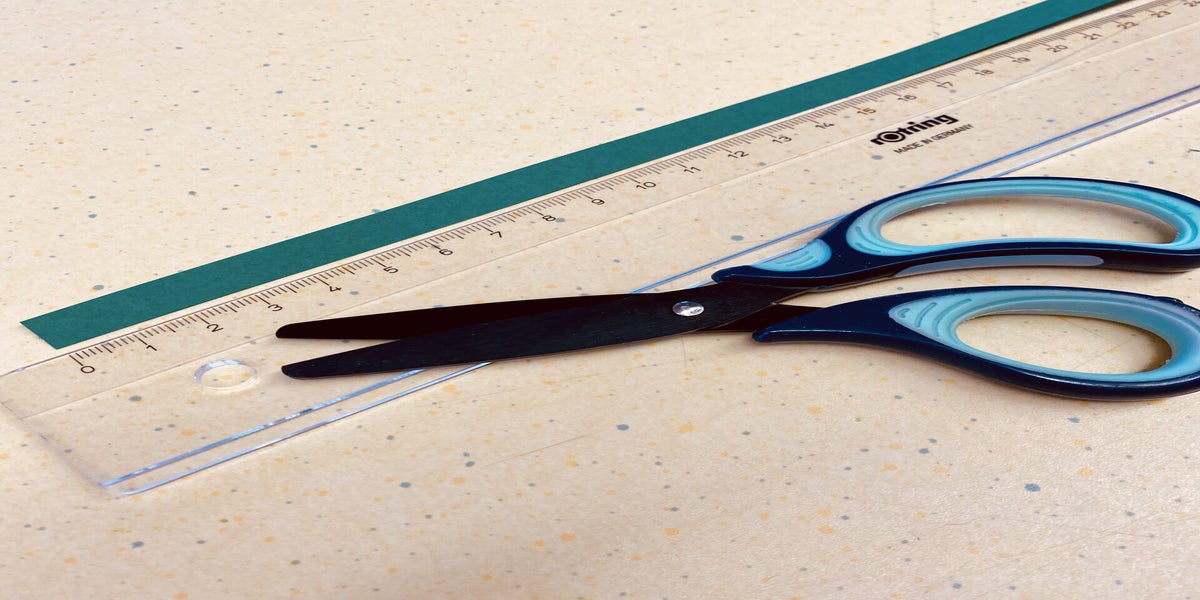 2. Grüne Papierstreifen mit einem Lineal abmessen und bei 10 cm abschneiden.