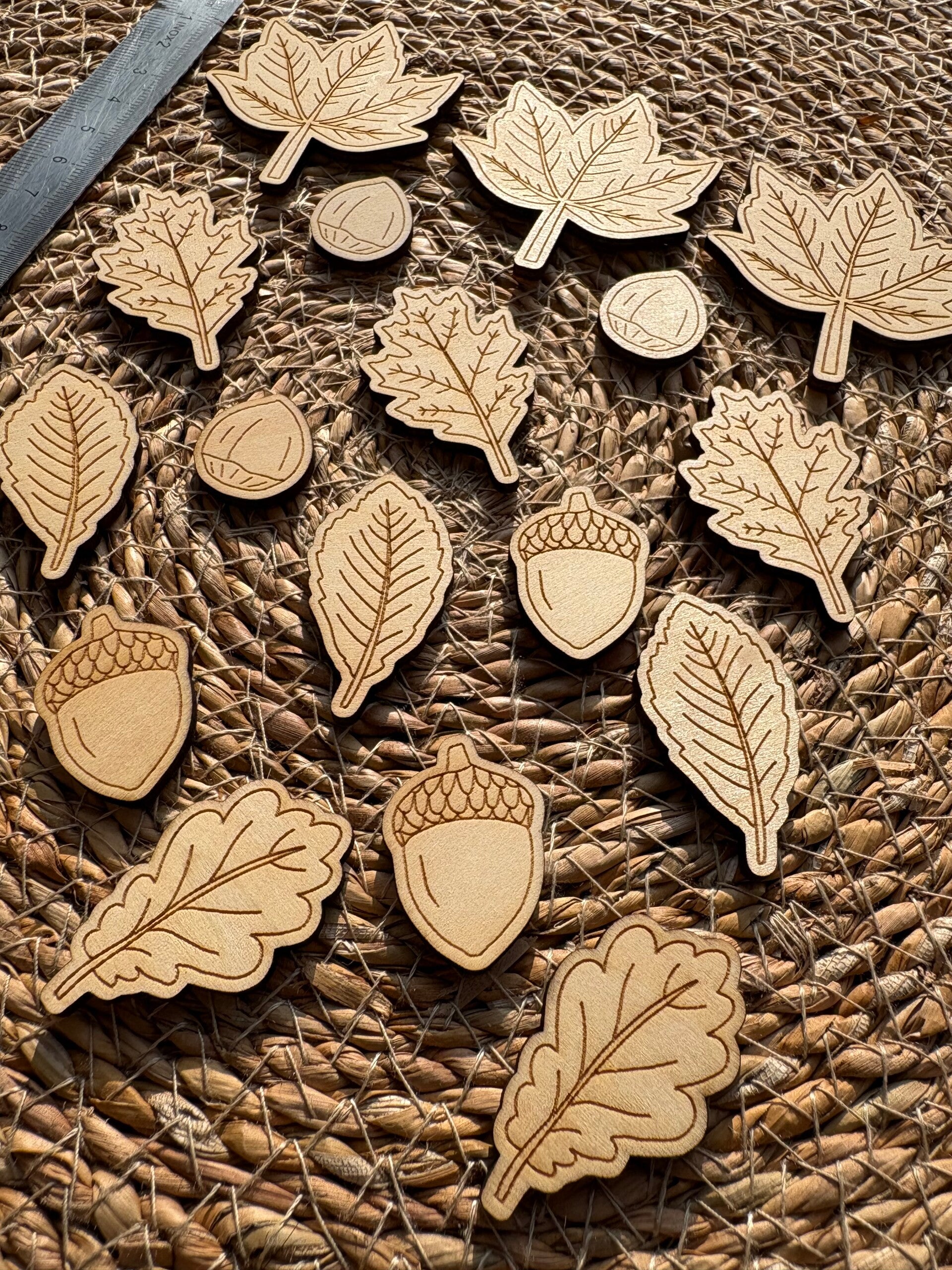 Diese Herbstmotive sind aus Sperrholz und können für verschiedenste Aufgaben, Aktivitäten oder Bastelarbeiten genutzt werden. In einem Set sind 12 Herbstblätter und 6 Nüsse/Eicheln (je 3) enthalten.